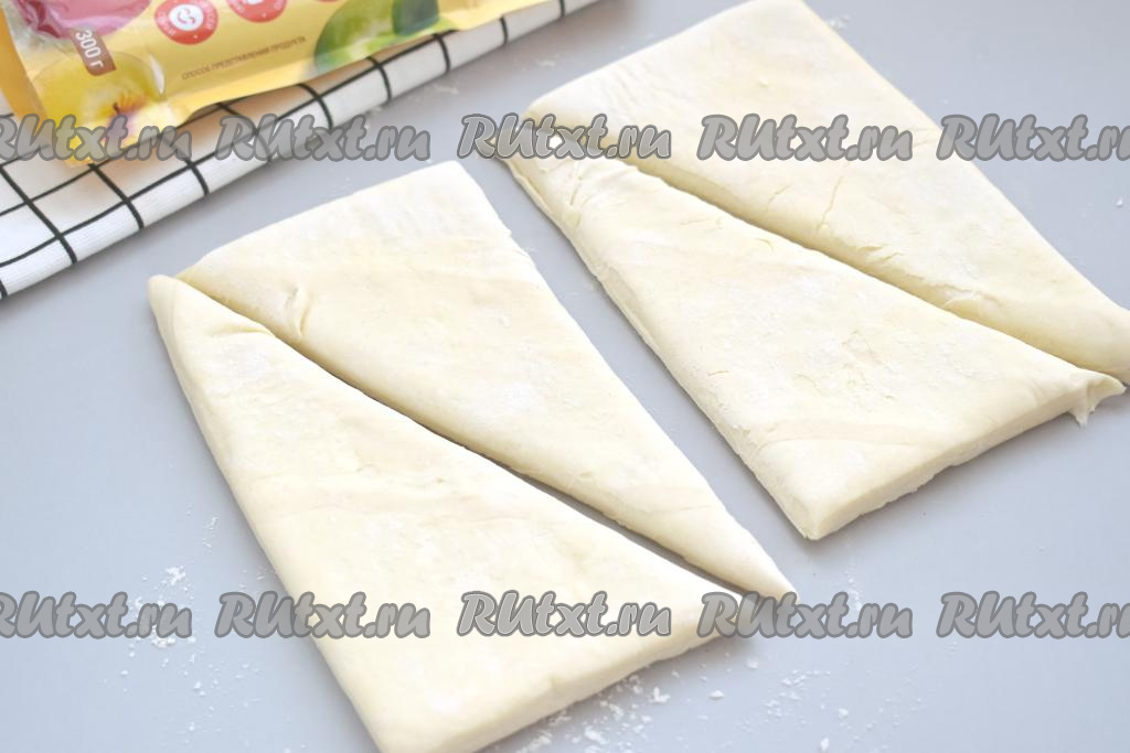 Теперь каждую половинку теста разрезаем по диагонали, получатся 4 треугольника из теста.
