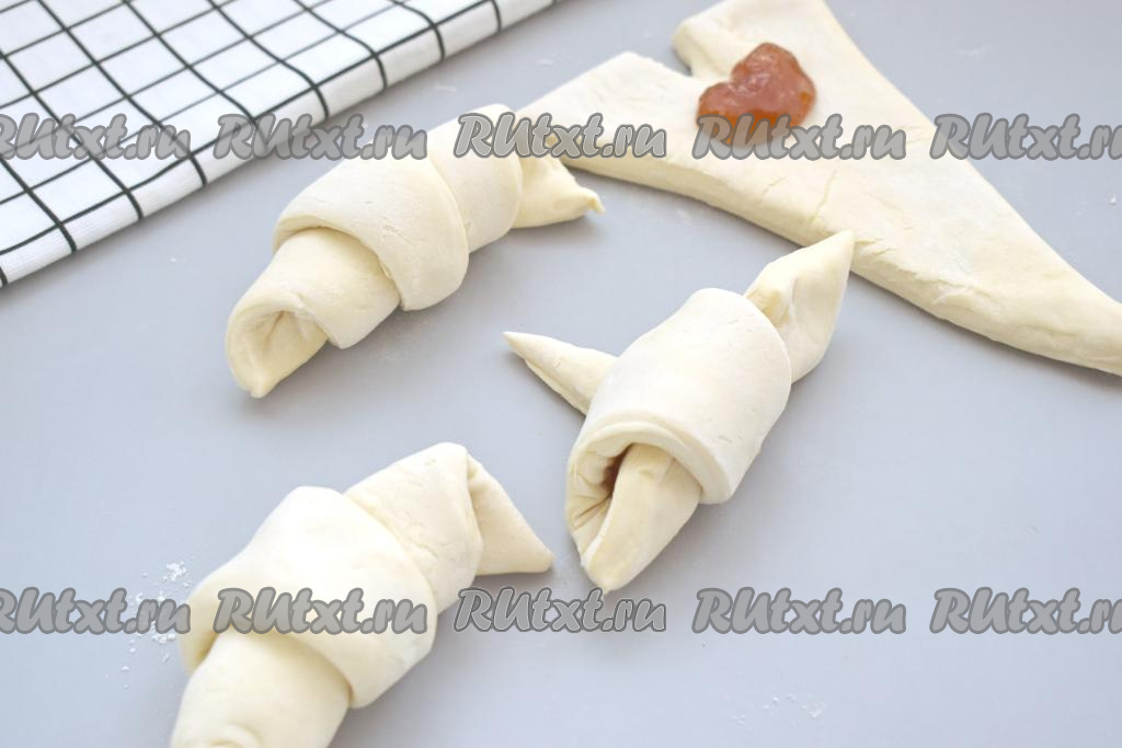 Начиная со стороны с надрезом, аккуратно сворачиваем треугольник из слоёного теста в рогалик. Хвостик получившегося рогалика должен быть снизу. Постепенно формируем все 4 круассана с повидлом.