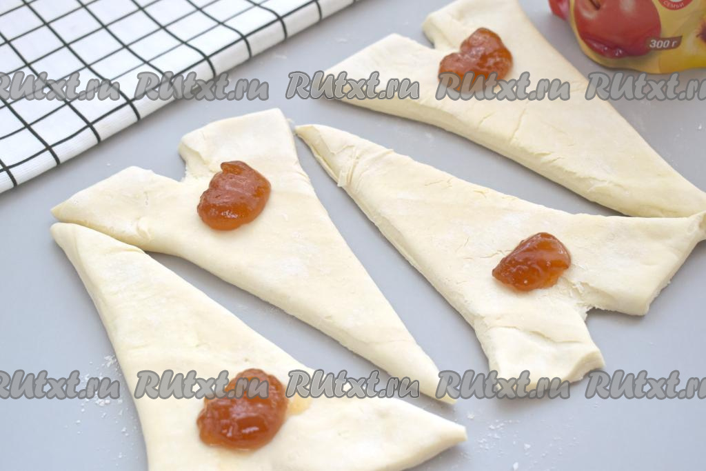 Возле надреза, отступив от краёв теста по 1 сантиметру, выкладываем 1 чайную ложку повидла.