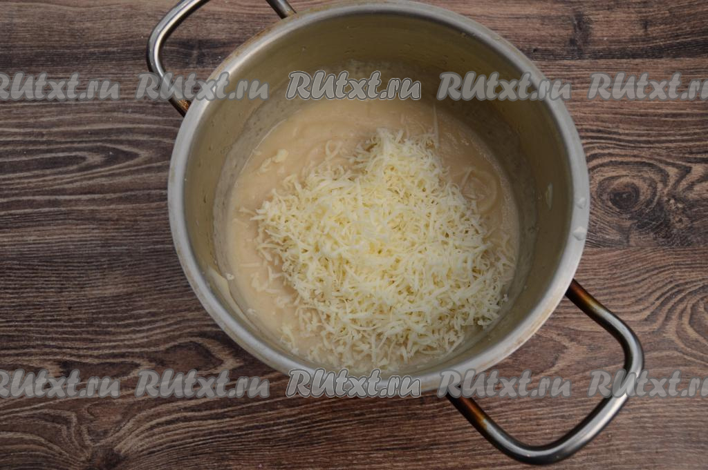 Твёрдый сыр натереть на мелкой тёрке, добавить в пюре из цветной капусты и яиц, перемешать лопаткой (или столовой ложкой) до однородности.