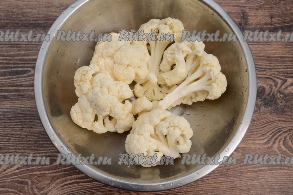 Цветную капусту промыть водой, срезать потемнения на поверхности кочана, если они есть. Разделить капусту на соцветия.
