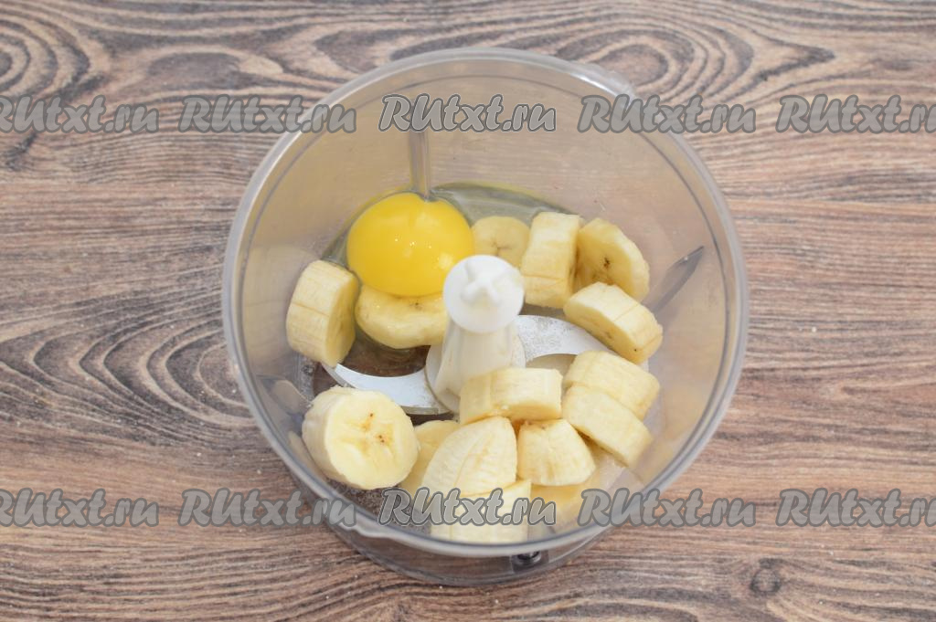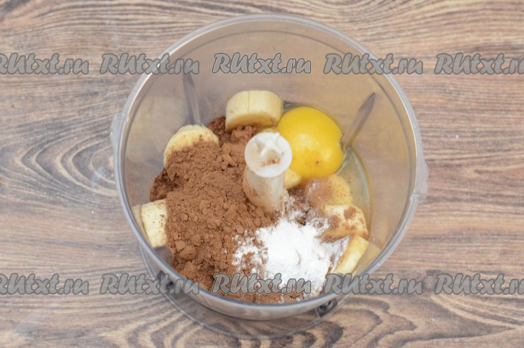 Если у вас нет измельчителя, тогда можно довести массу до однородности погружным блендером или вручную. Если тесто замешивать руками, тогда сначала нужно вилкой растереть банан до получения пюре, а после этого добавить остальные ингредиенты и перемешать лопаткой до однородности.