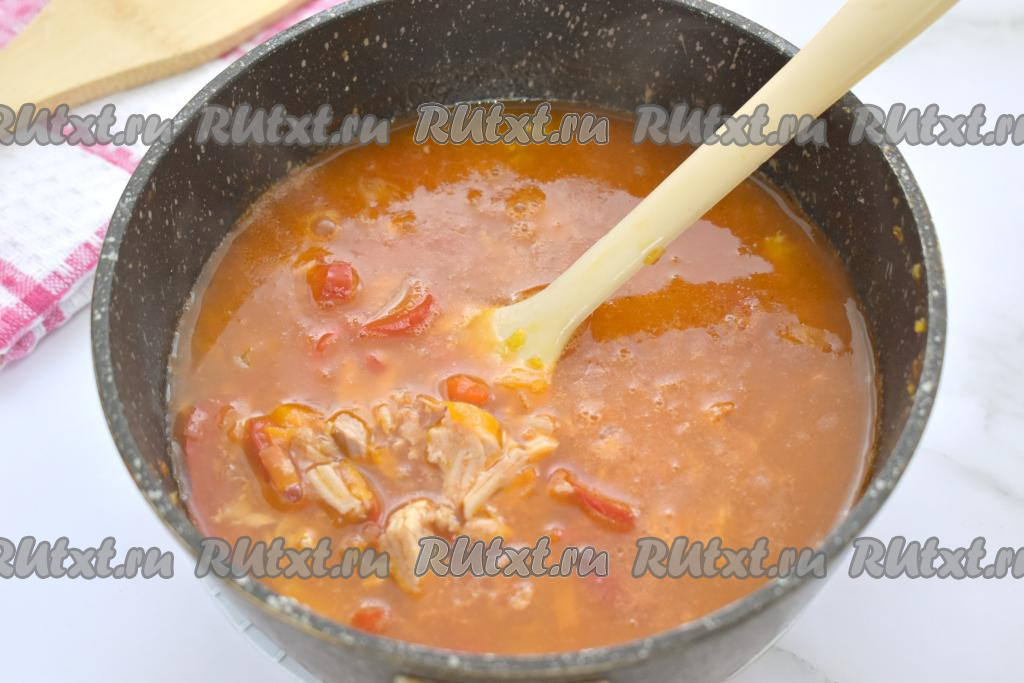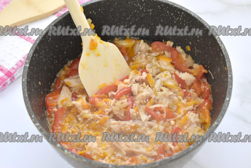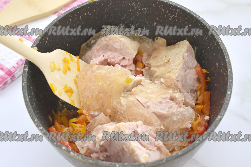 Теперь добавляем к овощам тушёнку, предварительно убрав жир (я взяла тушёнку из индейки).