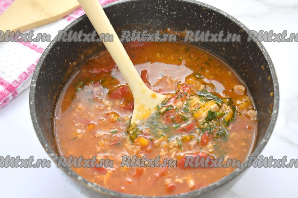 Даём томатной подливке закипеть, уменьшаем огонь, тушим гуляш из тушёнки 7-10 минут. В конце приготовления, по желанию, можно добавить мелко нарезанную зелень (у меня - укроп), перемешиваем, доводим до кипения и убираем с огня.