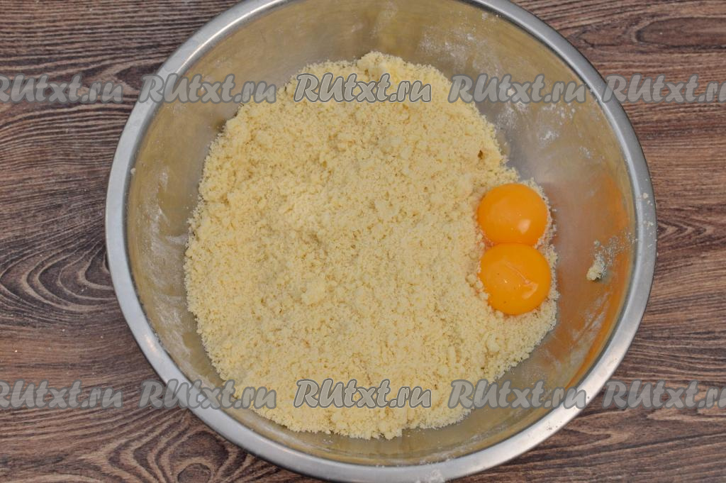 Масло с сухими ингредиентами перетереть руками до получения мелкой, однородной песочной крошки. В миску с песочной крошкой выложить желтки.