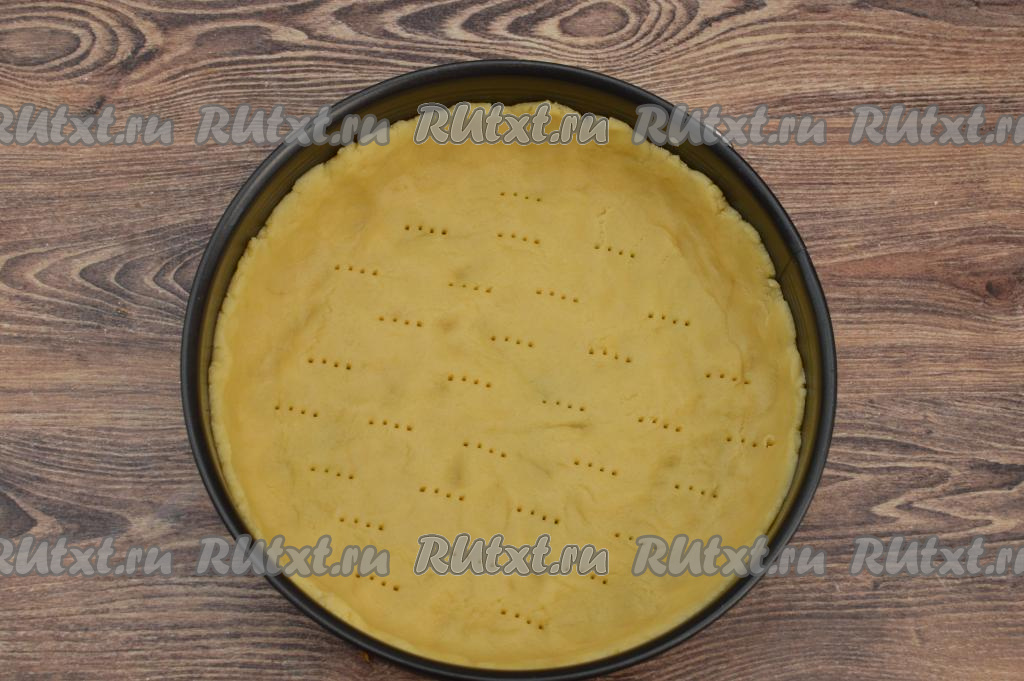 Дно и бока формы для выпечки диаметром 23 сантиметра немного смазать растительным маслом, затем выложить тесто, равномерно распределить его по дну формы, формируя небольшие бортики. Тесто на дне формы наколоть вилкой, чтобы оно меньше вздувалось во время выпечки.