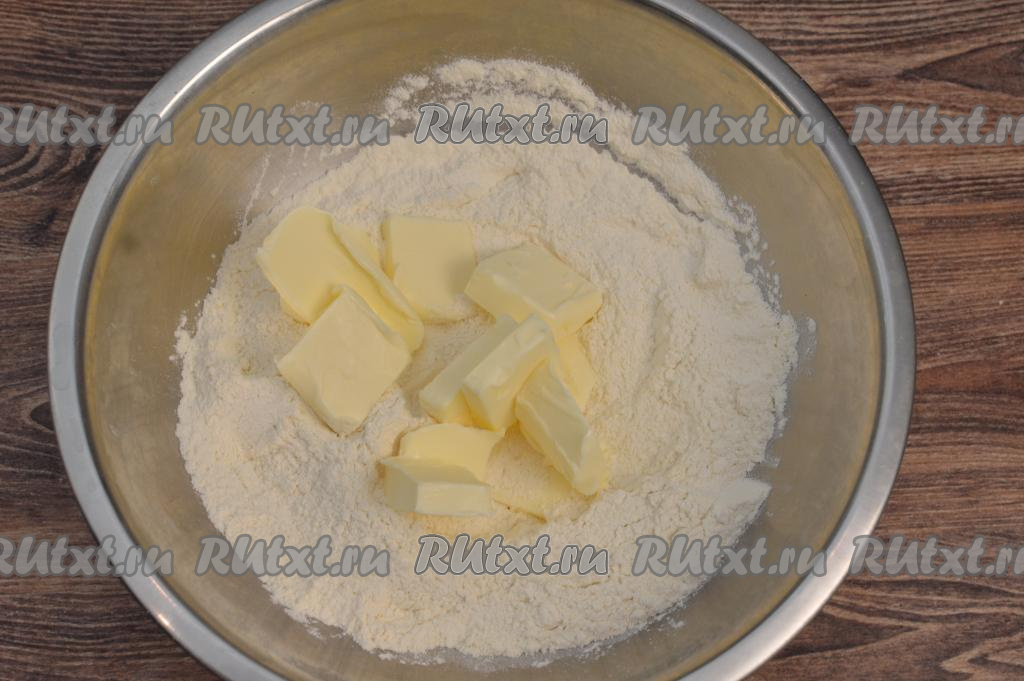 В достаточно объёмной миске нужно соединить сухие ингредиенты: муку, сахар, соль, разрыхлитель, перемешать. Достать из холодильника сливочное масло, нарезать его на кусочки, выложить в миску с сухими ингредиентами.