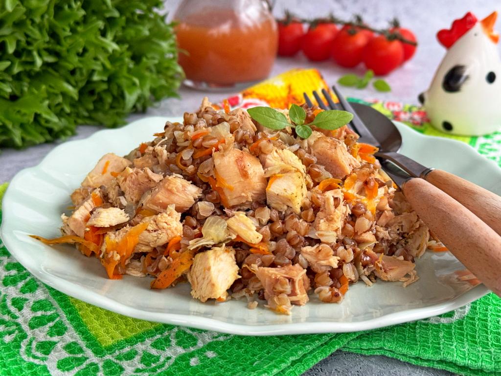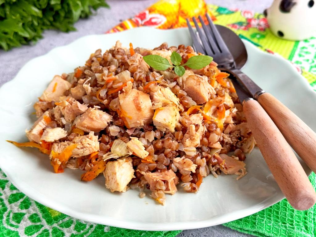 Рассыпчатую гречку вместе с нежными кусочками копчёной курицы разложить со сковороды по тарелкам и в горячем виде подать вкусное, очень ароматное и сытное блюдо к столу.