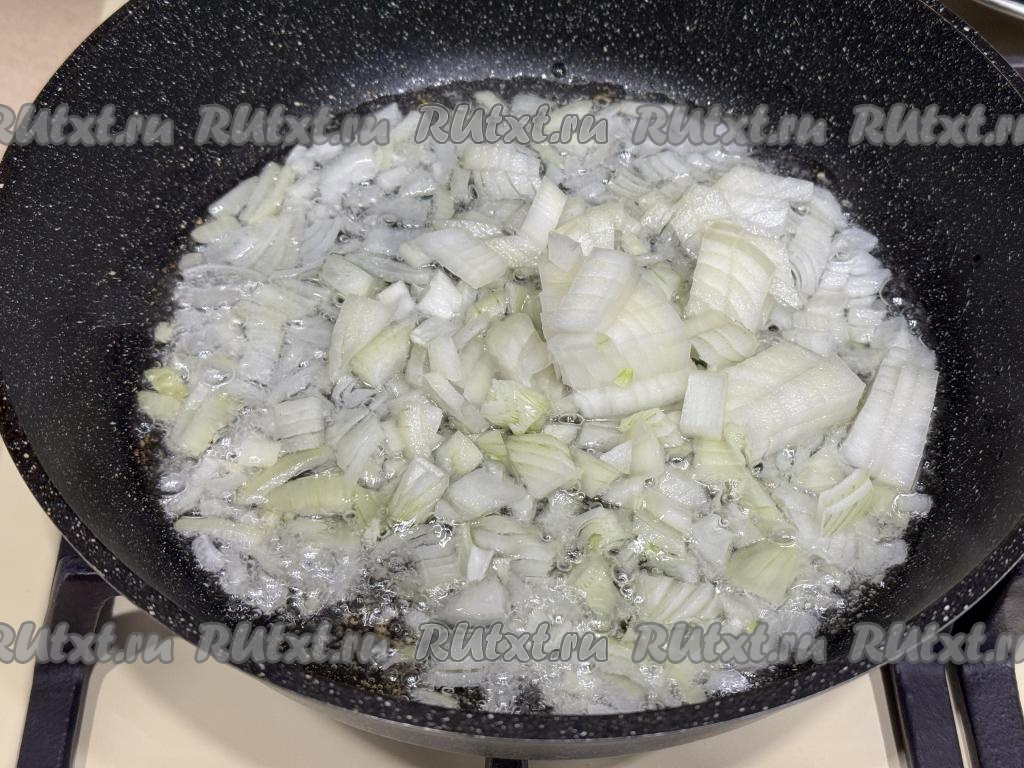 В сковороду влить растительное масло, хорошо его разогреть на огне выше среднего, выложить мелко нарезанный лук, уменьшить огонь до среднего.