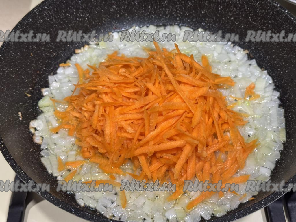 Обжарить лук до прозрачности (обычно на жарку требуется минуты 3-4), иногда помешивая, после этого добавить натёртую на крупной тёрке морковку, перемешать овощи.