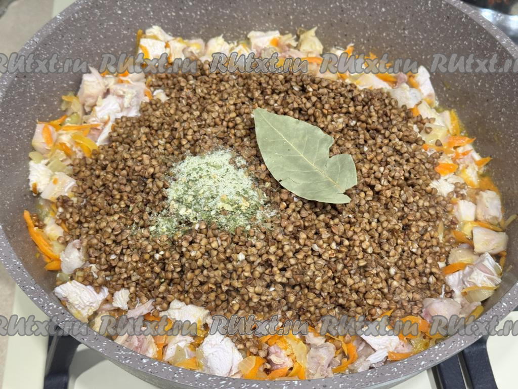Затем выложить подготовленную гречку в сковороду, добавить лавровый лист, соль и специи по вкусу.