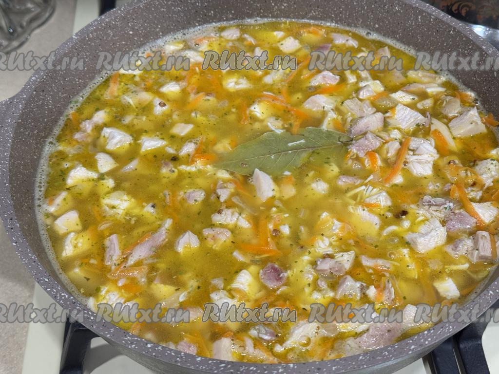 Обжарить морковь с луком вместе в течение 5-7 минут (до мягкости морковки). К обжаренным овощам добавить мясо копчёной курицы, нарезанное на средние кубики.