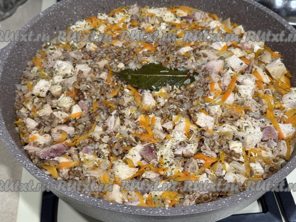 Влить в сковороду 400 миллилитров кипящей воды, перемешать гречку с курицей.