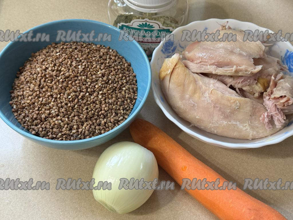 Подготовить продукты. Гречку, если нужно, перебрать, затем выложить в сито, очень хорошо промыть под проточной водой. Лук и морковь почистить. Для этого блюда я предпочитаю брать копчёное мясо с грудки или бёдер курицы.