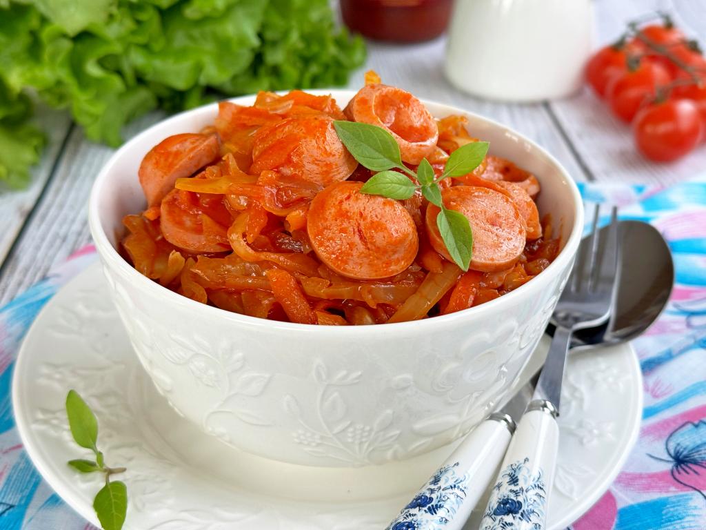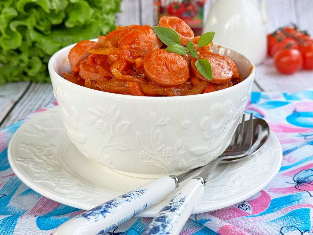 Предлагаю приготовить простое, вкусное и сытное блюдо - квашеную капусту, тушёную с сосисками в томатном соусе на сковороде. Капуста получается очень вкусной, нежной, пикантной, она отлично сочетается с сосисками. Это блюдо вполне можно подать на ужин. Просто, сытно и вкусно, попробуйте!