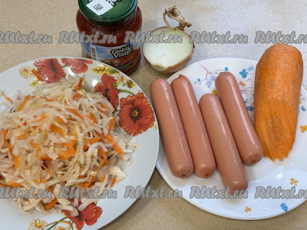 Подготовить продукты. Лук и морковь очистить. Снять плёнку с сосисок. Если квашеная капуста достаточно кислая, тогда её нужно промыть водой, после этого отжать лишнюю жидкость.