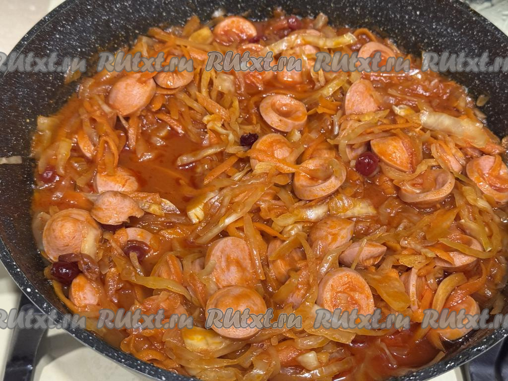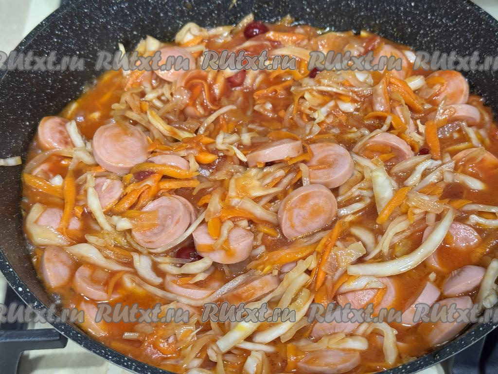 Перемешать капусту с сосисками и томатным соусом. Дать соусу закипеть, уменьшить огонь, тушить квашеную капусту с сосисками под крышкой в течение 25 минут (до мягкости капусты), периодически перемешивая.
