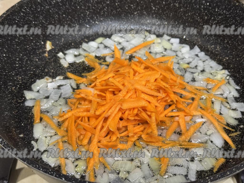 Обжарить лук в течение 3-4 минут (до прозрачности), периодически помешивая, на среднем огне. К обжаренному луку добавить натёртую на крупной тёрке морковку, перемешать, немного подсолить овощи.