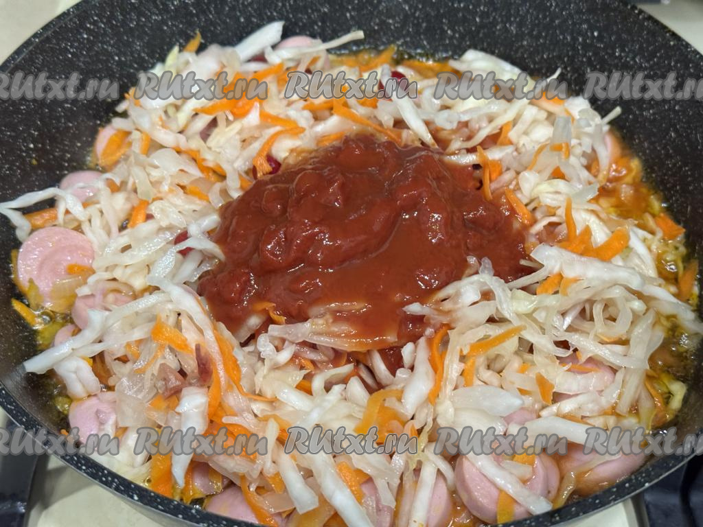 В сковороду с морковкой, луком и сосисками добавить квашеную капусту, влить получившийся томатный соус.