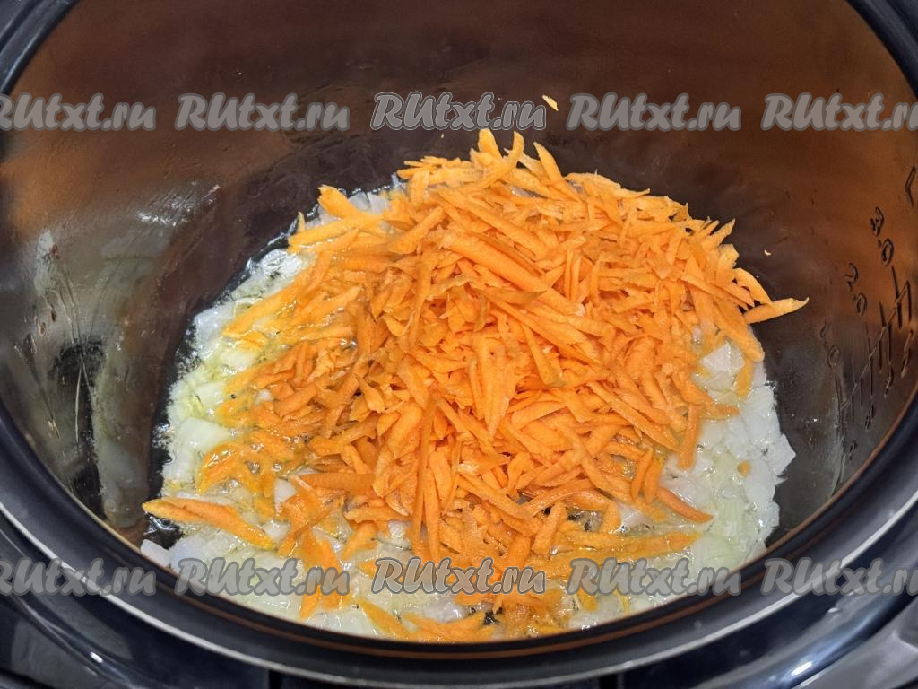 Обжарить лук, не закрывая крышку мультиварки и периодически перемешивая, 5 минут. Затем выложить морковку, натёртую на крупной тёрке, сразу перемешать овощи. Обжарить их до окончания режима "Жарка", не закрывая крышку мультиварки, время от времени перемешивая.