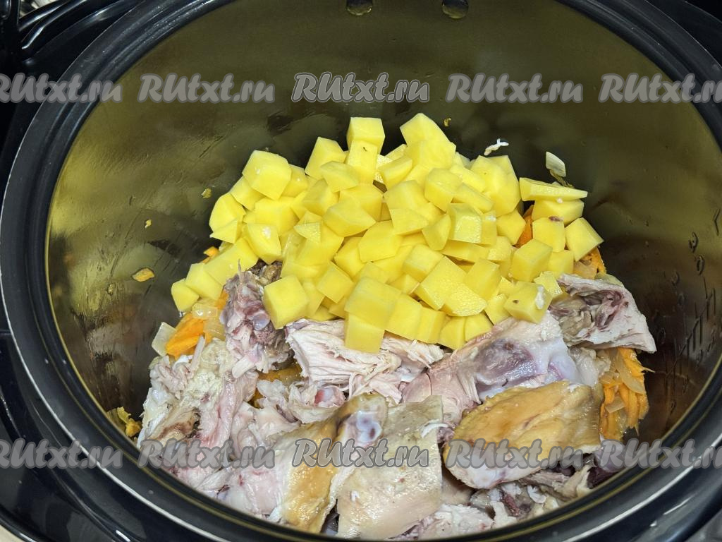 В чашу с обжаренными овощами добавить копчёную курицу и нарезанную на средние кубики картошку.