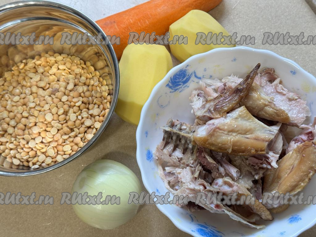 Подготовить продукты. Картошку, лук и морковь почистить. Очищенный картофель залить полностью водой, чтобы клубни не потемнели. Копчёную курицу нарезать на кусочки, при желании, можно отделить мясо от костей (я отделять не стала). Горох (у меня - колотый горох) выложить в сито, хорошо промыть под проточной водой. Промытый горох выложить в глубокую миску, залить полностью водой и оставить на 40-60 минут, затем откинуть на сито, промыть водой, лишней воде дать стечь.