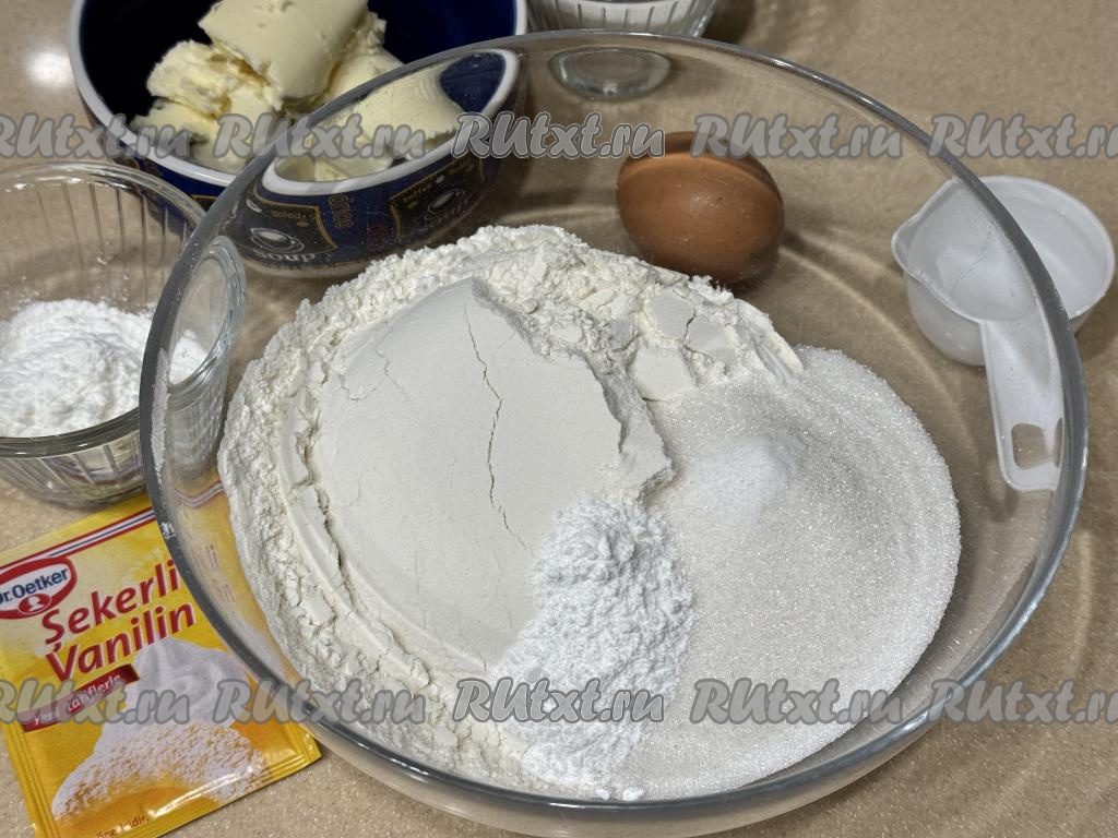 В глубокой миске соединить муку и сахар, добавить соль и разрыхлитель.