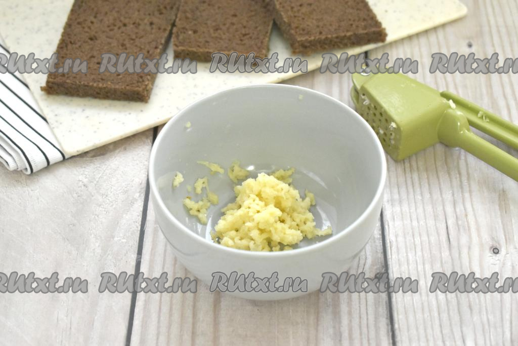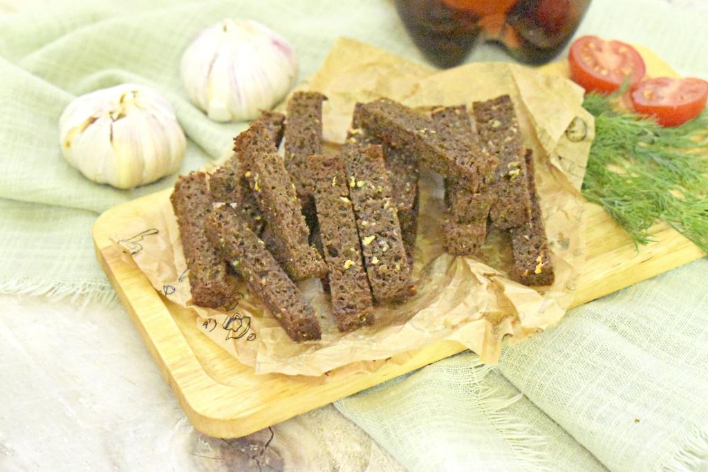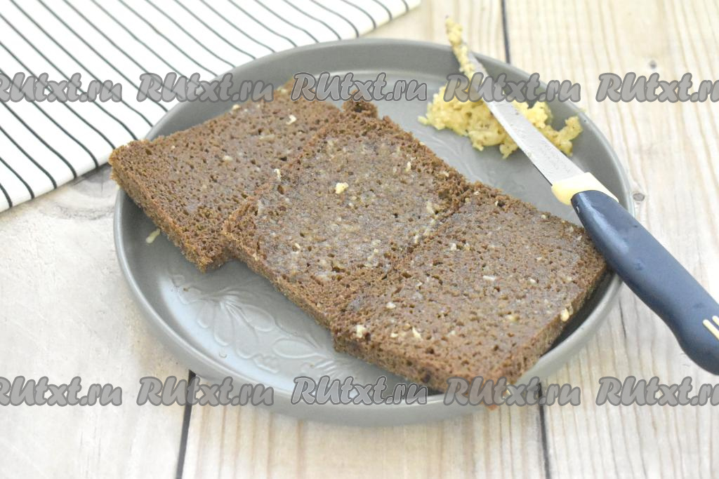 Чёрный хлеб, пропитанный чесночной массой, нарезаем на брусочки.