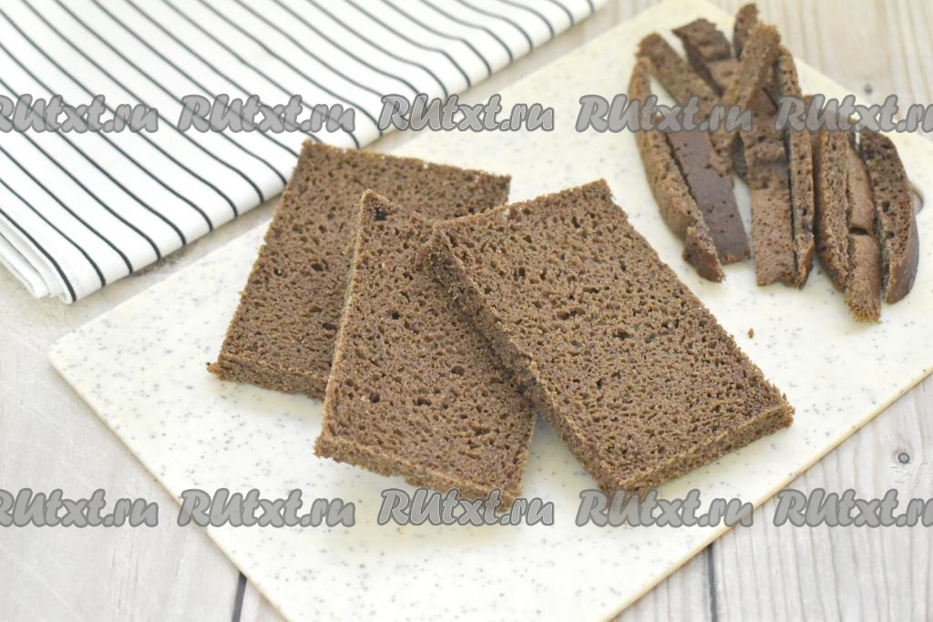Нарезаем чёрный хлеб на ломтики толщиной 1 сантиметр. По желанию отрезаем корочки у хлеба.