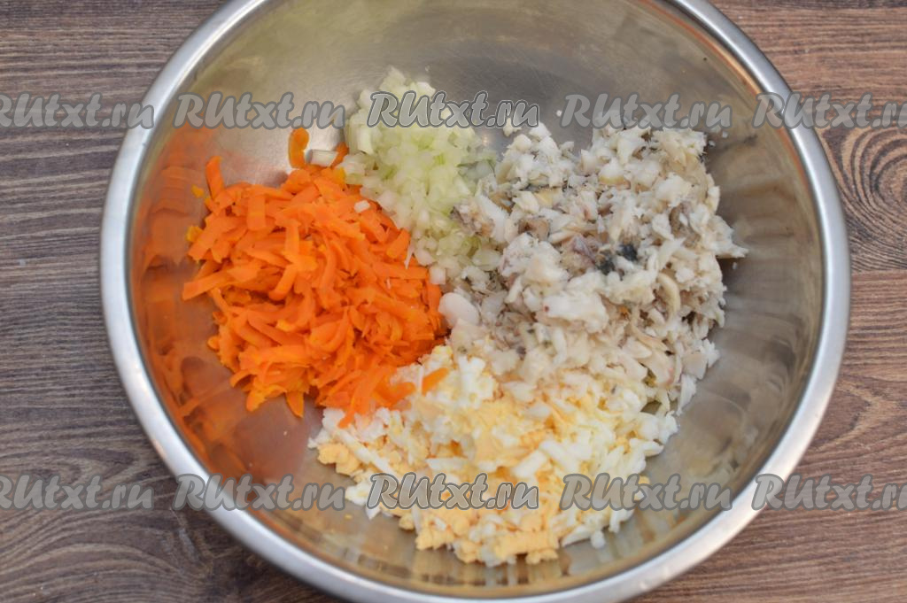 В миску с яйцами и морковью добавить нарезанные рыбу и лук.