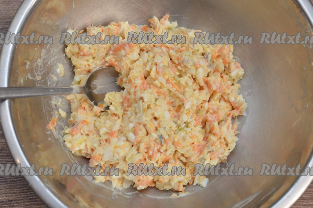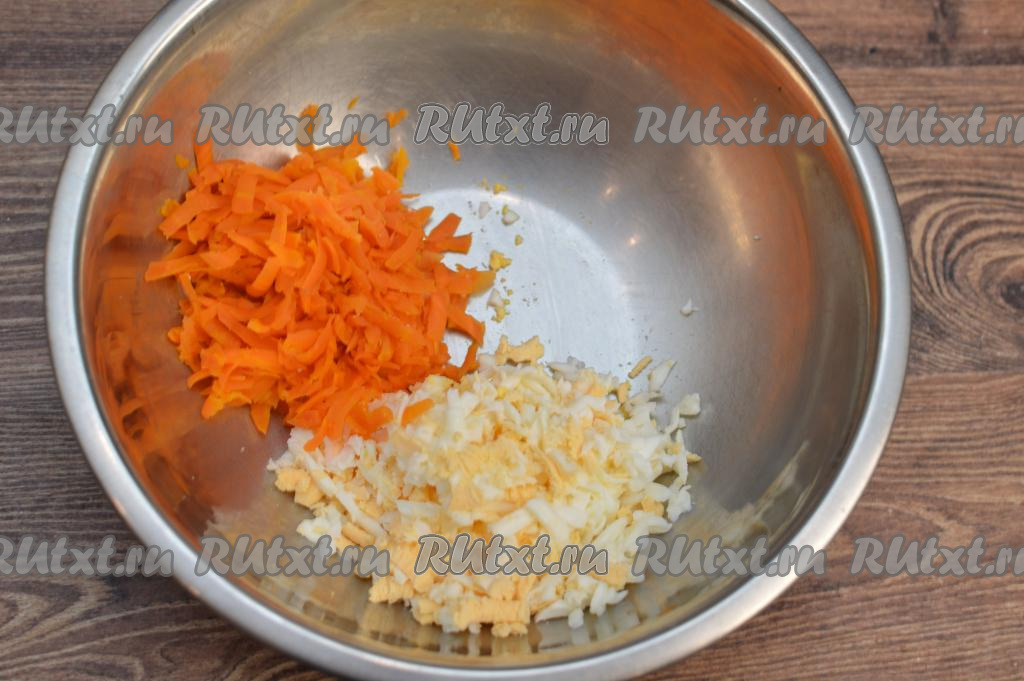 В эту же миску добавить варёную морковку, натёртую на крупной тёрке.