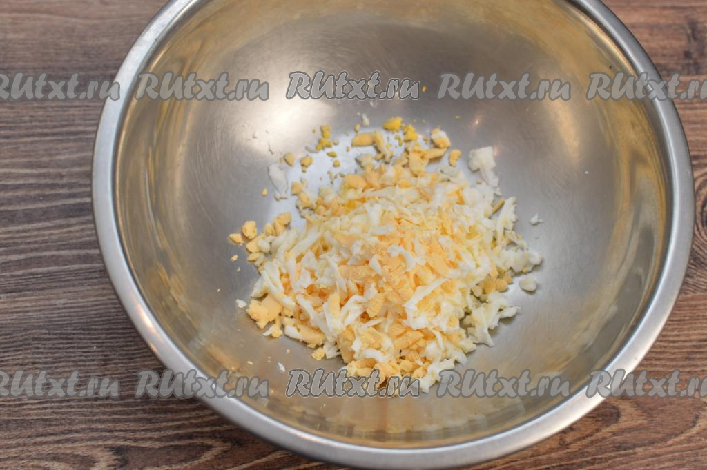 Пока минтай остывает, нужно натереть варёные яйца на крупной тёрке в глубокую миску.