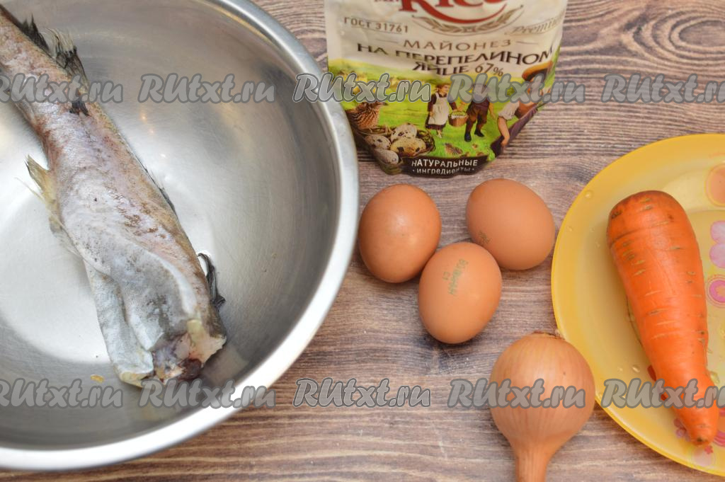 Подготовить продукты. Минтая полностью разморозить при комнатной температуре. Морковку вымыть и, не очищая от кожуры, выложить в кастрюлю, залить полностью водой, поставить на сильный огонь и отварить с момента закипания воды на небольшом огне до готовности (в течение 25-30 минут, готовая морковка будет легко прокалываться ножом). Яйца отварить в течение 10 минут с момента закипания воды. Отваренные морковку и яйца остудить и очистить.