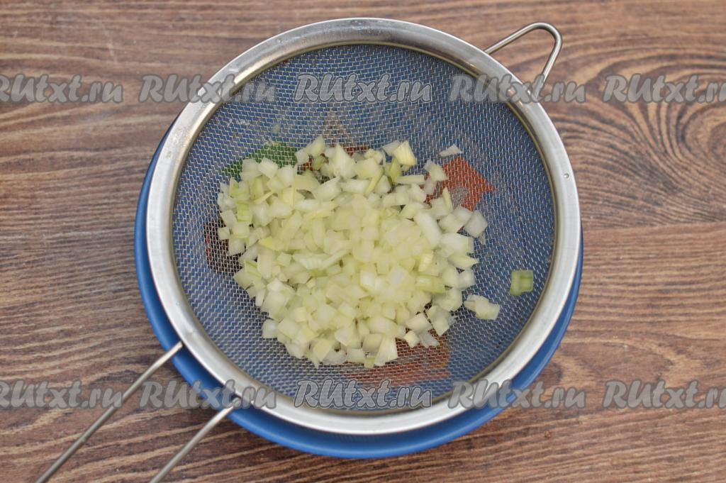 Лук очистить, нарезать мелко, выложить в сито, тщательно обдать кипятком, оставить на несколько минут в сите, чтобы стекла лишняя вода.