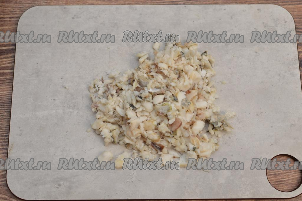 Остывшие кусочки минтая отделить от костей и кожи. Получившееся филе минтая нарезать достаточно мелко.
