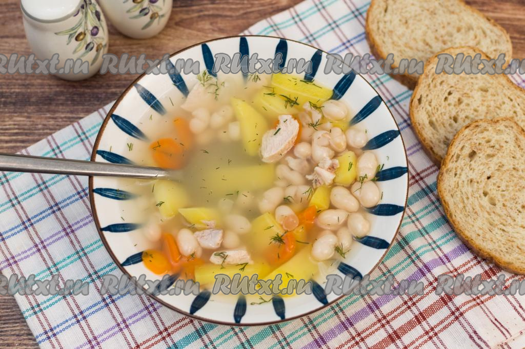 Аппетитный, насыщенный, очень вкусный суп, сваренный из белой сухой фасоли с курицей, разлить по тарелкам. Добавить в каждую тарелку, по желанию, зелень. Подать фасолевый суп в горячем виде к столу.