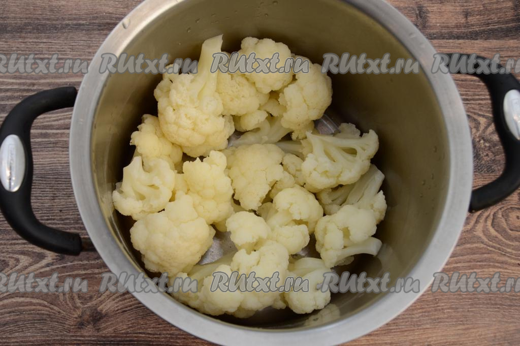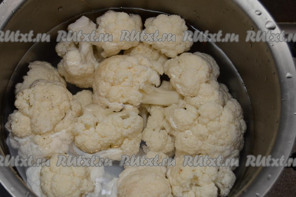 Выложить капусту в кастрюлю, залить полностью водой и поставить на сильный огонь. Как только вода закипит, уменьшить огонь. Варить цветную капусту до готовности (в течение 5-7 минут). Соцветия должны стать достаточно мягкими, легко прокалываться ножом, но при этом они должны хорошо держать форму.