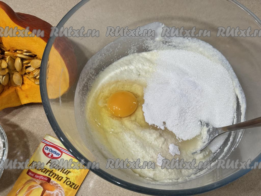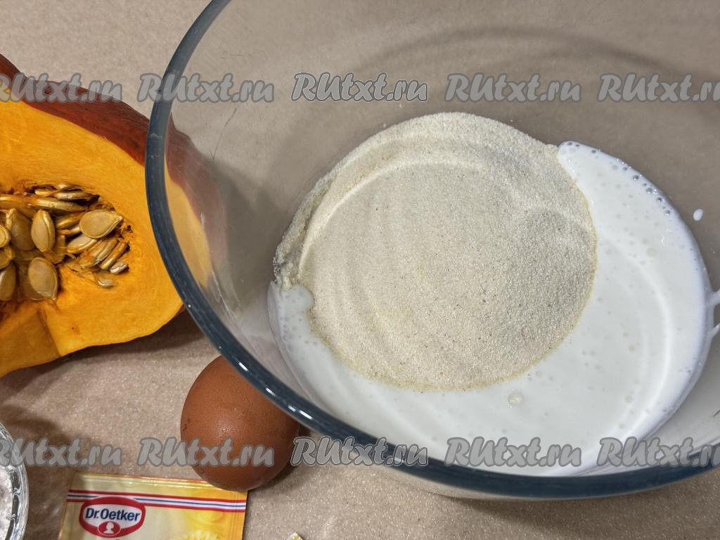В миску с манкой, набухшей в кефире, добавить натёртую тыкву, перемешать.