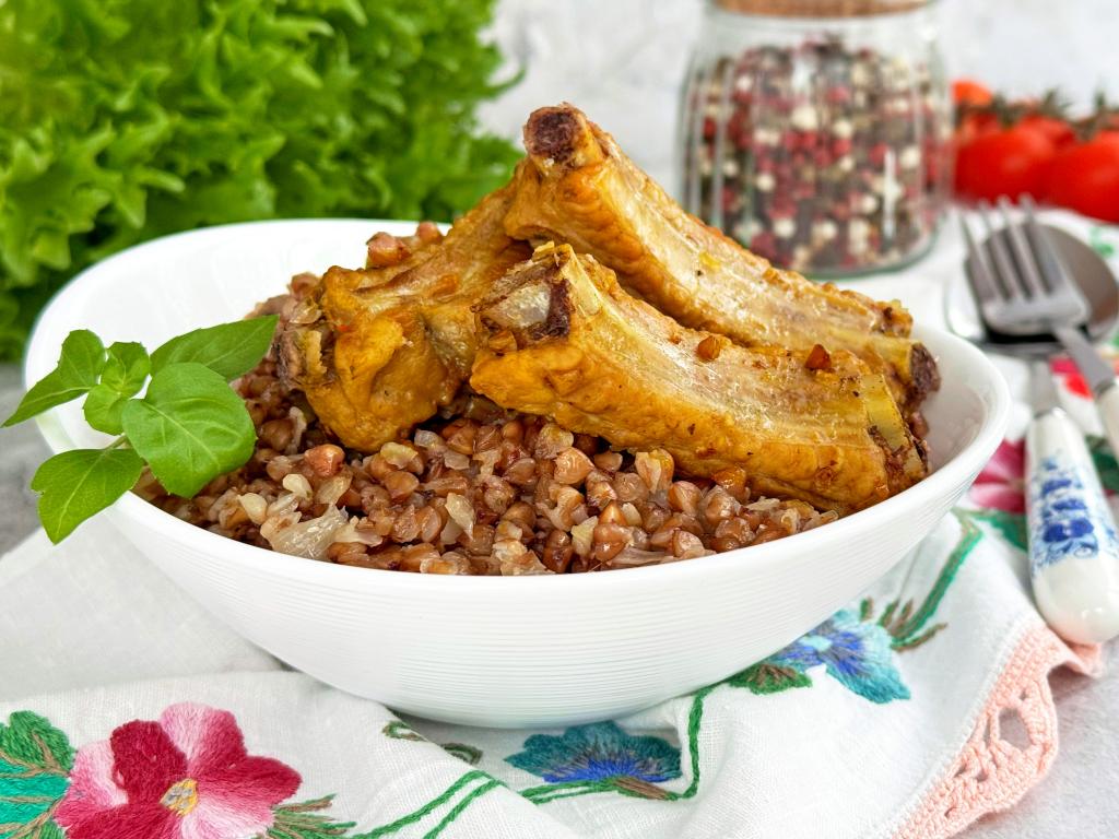 Предлагаю разнообразить меню и приготовить свиные рёбрышки с гречкой на сковороде. Рецепт достаточно простой, а блюдо получается просто замечательным! Гречка в процессе томления становится рассыпчатой, ароматной, а рёбрышки - нежными, мясо прекрасно отходит от кости. Это очень вкусное и сытное блюдо можно подать в качестве полноценного обеда или ужина, дополнив, по желанию, овощным салатом.