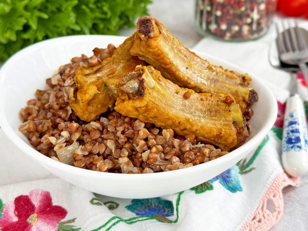 Рассыпчатую гречку вместе в нежными, сочными свиными рёбрышками разложить со сковороды по тарелкам и подать сытное, вкусное, ароматное блюдо в горячем виде к столу.