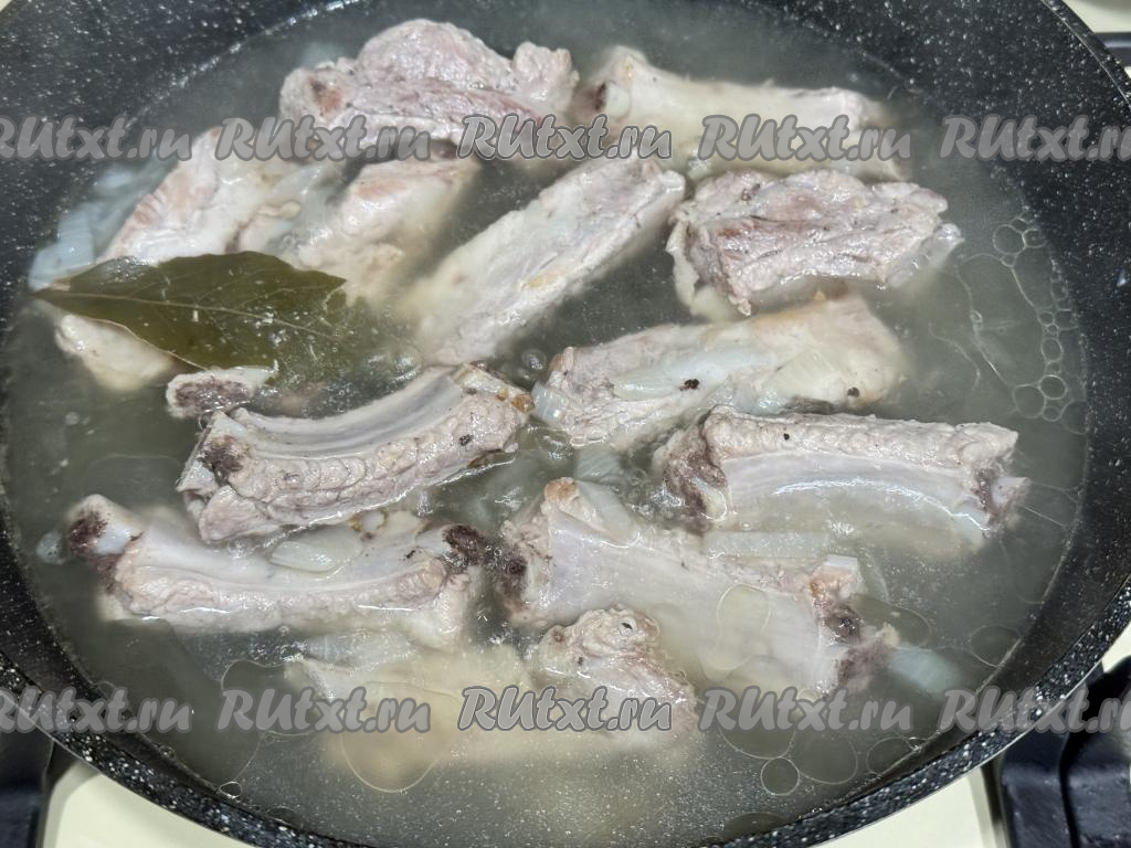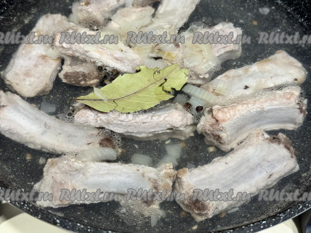 По прошествии 40 минут с начала закипания воды рёбрышки приготовятся, в сковороде у нас получится насыщенный бульон.