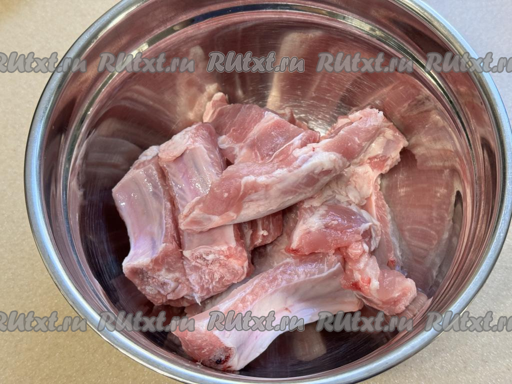 Свиные рёбрышки промыть водой, обсушить. Разрезать рёбра на порционные кусочки.
