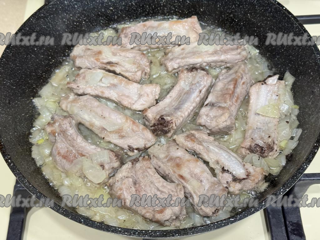 Обжарить рёбра с луком в течение 5 минут (до прозрачности лука), иногда перемешивая, на среднем огне.