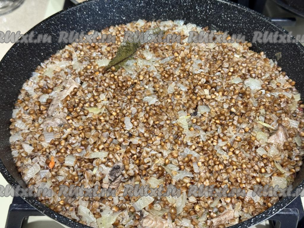 Перемешать гречку с рёбрами, довести бульон до кипения, уменьшить огонь до минимума. Закрыть сковороду крышкой, готовить минут 20-25 (до полного впитывания воды).