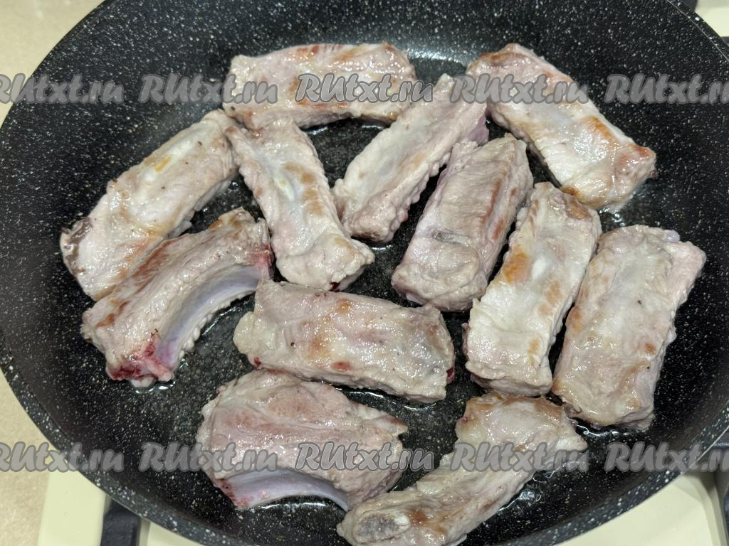 Обжарить рёбра с двух сторон до золотистого цвета на достаточно сильном огне.