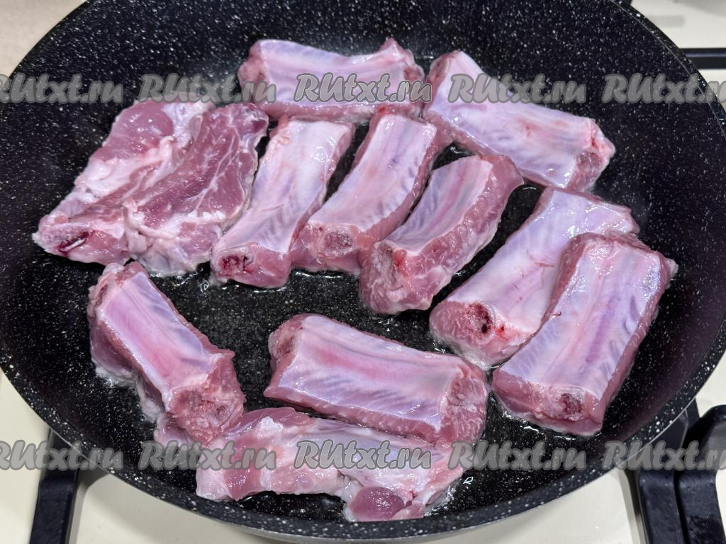 В достаточно глубокую сковороду влить растительное масло, разогреть, затем выложить свиные рёбрышки в один слой.