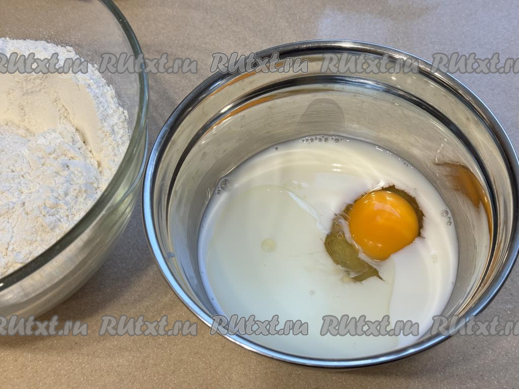 Пока варится каша из пшена и тыквы, замесим тесто для кыстыбыя. Для этого в миску нужно влить молоко, добавить яйцо, соль и растительное масло.