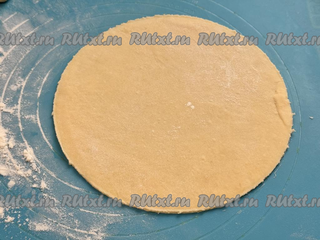 Тесто разделить на 8 равных частей. Каждую часть теста на присыпанной мукой поверхности раскатать в лепёшку диаметром 16 сантиметров. Поверх раскатанного теста приложить тарелку диаметром 16 сантиметров, обрезать края теста, чтобы у лепёшки были ровные края. Обрезки теста, оставшиеся после раскатывания 8 лепёшек, собрать и тоже раскатать в лепёшку, в результате у меня получились 9 раскатанных лепёшек.