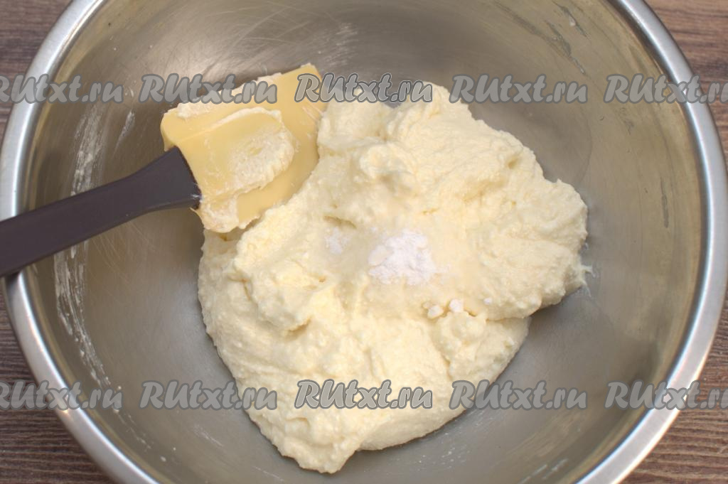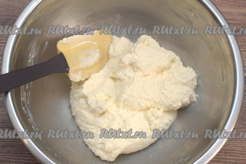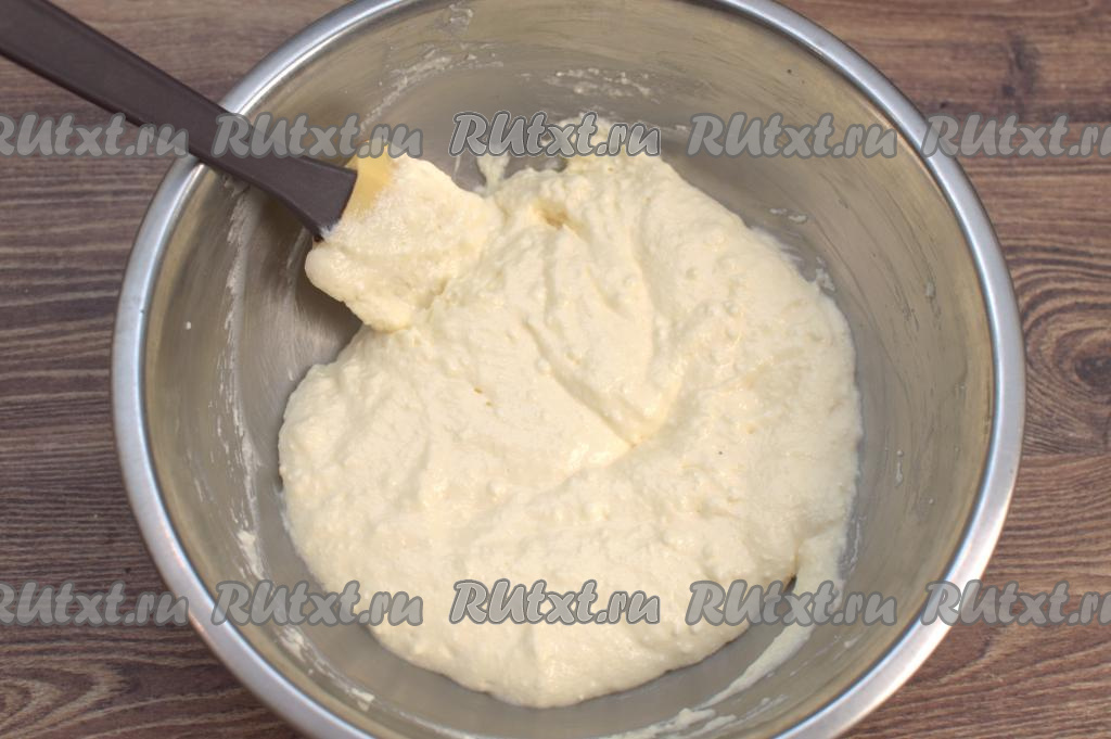 Пока натирали тыкву, творожная масса вступила в реакцию с содой, стала более воздушной и немного увеличилась в объёме.
