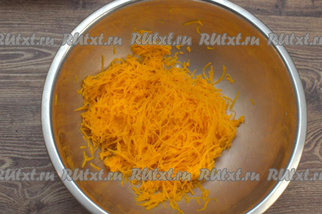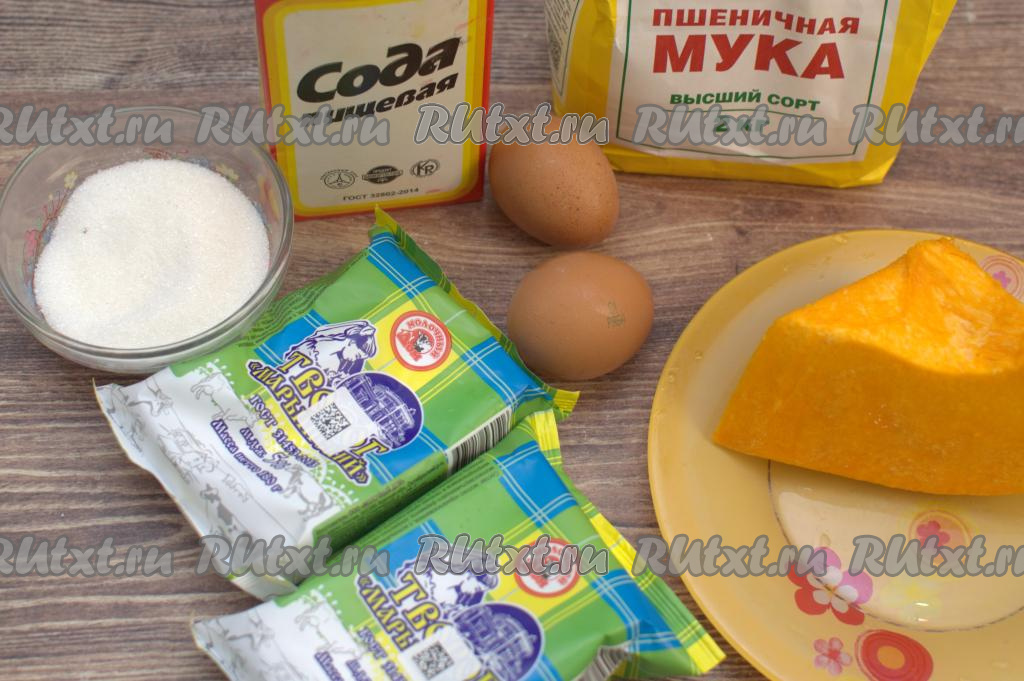 Подготовить продукты. Тыкву очистить от кожуры, удалить волокна с семечками. Нам потребуется 230 грамм очищенной тыквы. Творог лучше брать жирностью не менее 5%.